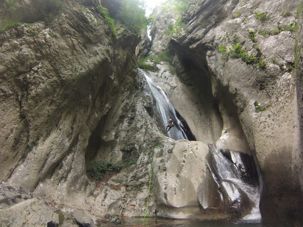 El descenso comienza por un tramo abierto con toboganes y varios destrepes el más largo de 10 m. que se hace por la izquierda, fuera del cauce.