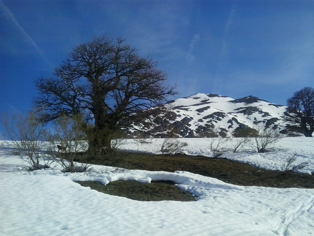 la ascensión por palas suaves de nieve, en las faldas de la Peña Ten, pasando junto a un gran ejemplar de